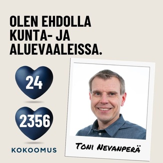Olen Toni Nevanperä, 45-vuotias, kolmannen kauden kunnanvaltuutettu ja nyt neljättä kertaa kuntavaaliehdokkaana. Olen toista kautta kunnanhallituksessa ja tämän kauden olen toiminut kunnanhallituksen puheenjohtajana. Olen töissä rakennustuoteteollisuudessa logistiikkapäällikkönä. Työn vastapainoksi harrastan metsänhoitoa, jota olen harrastanut jo lähes 30 vuotta. Pyöräilen myös paljon ja kokousmatkat kuljenkin pääasiassa polkupyörällä.